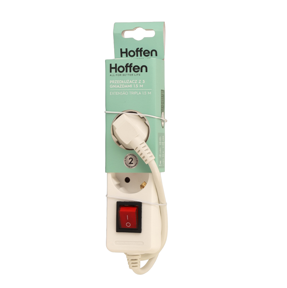 3-way Schuko socket with switch, 1,5 m extension cable, white – Hoffen, safe and practical for home or office use.