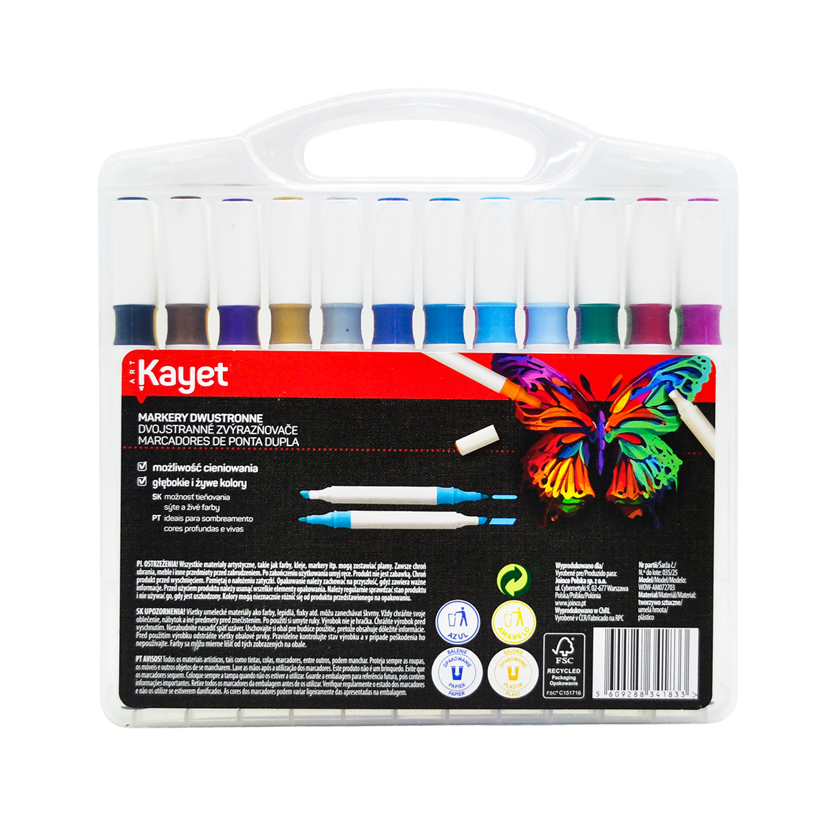 Double-sided markers with vivid and deep colours, suitable for shading. Two tips, 2 mm and 5 mm thick.