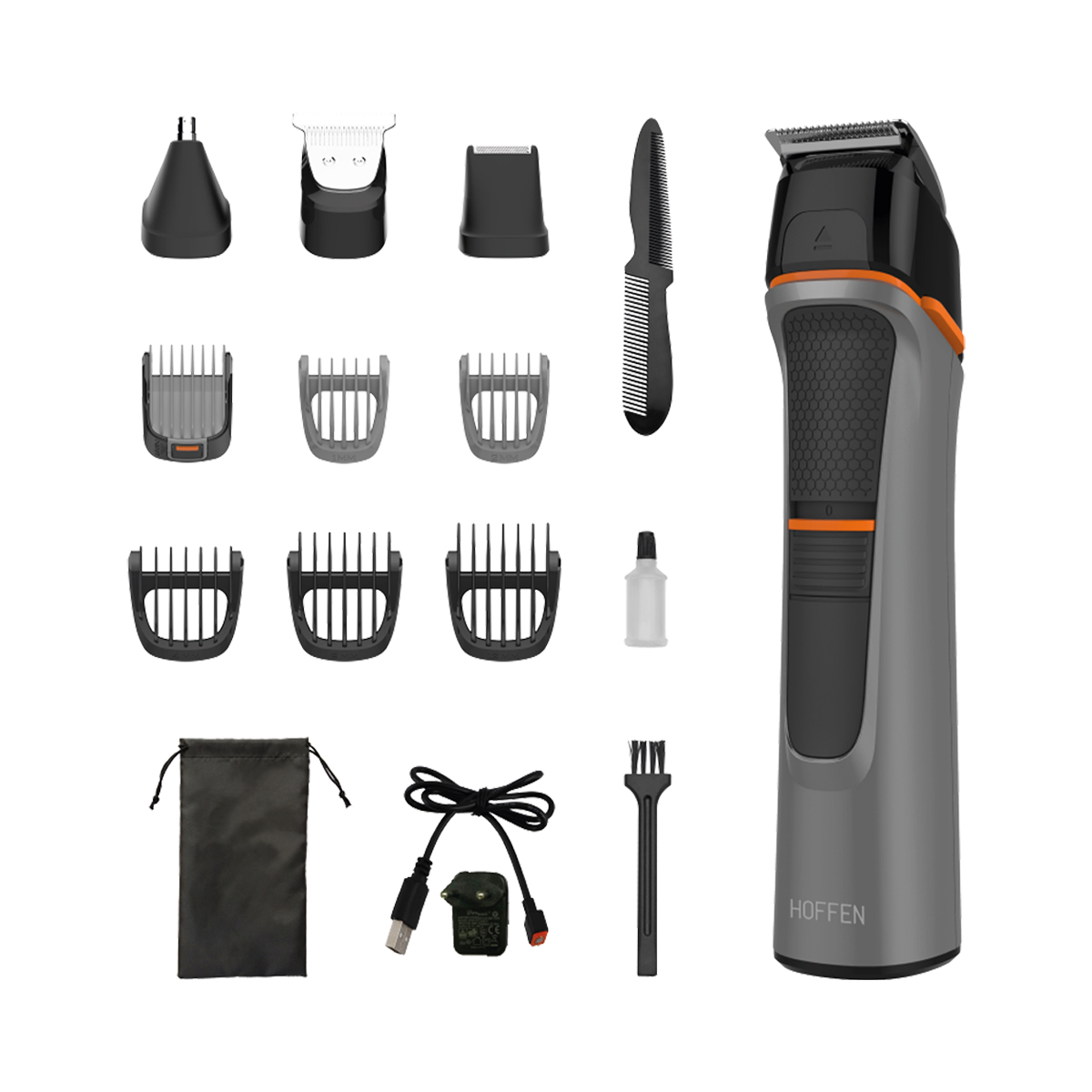 10-in-1 Multifunction Trimmer – 4 heads, 6 combs, 1 lubricating oil, 1 pouch, 1 magnetic USB cable with adapter, 1 brush