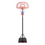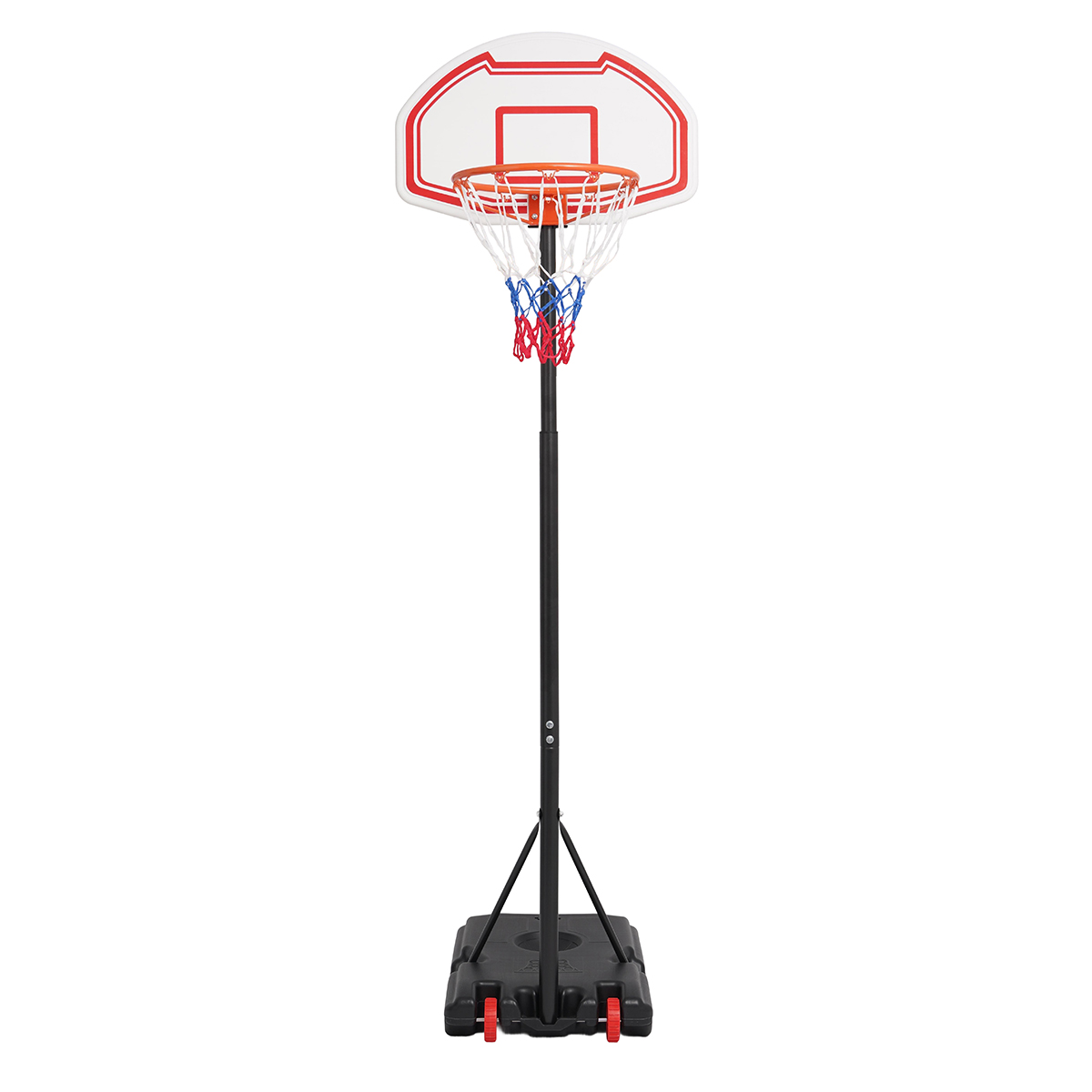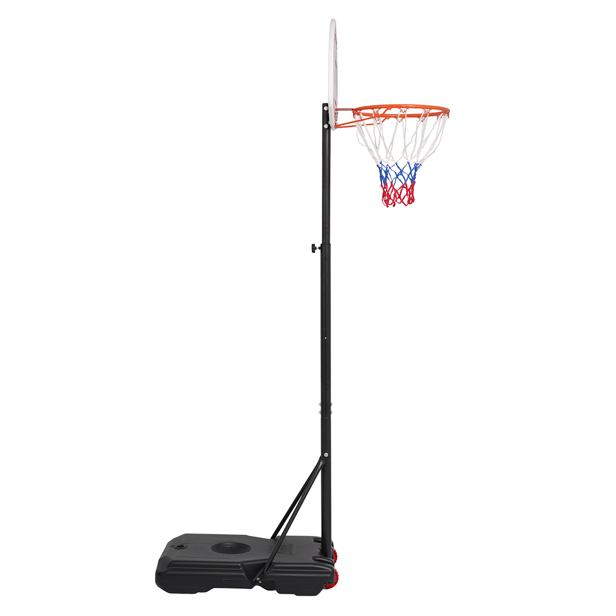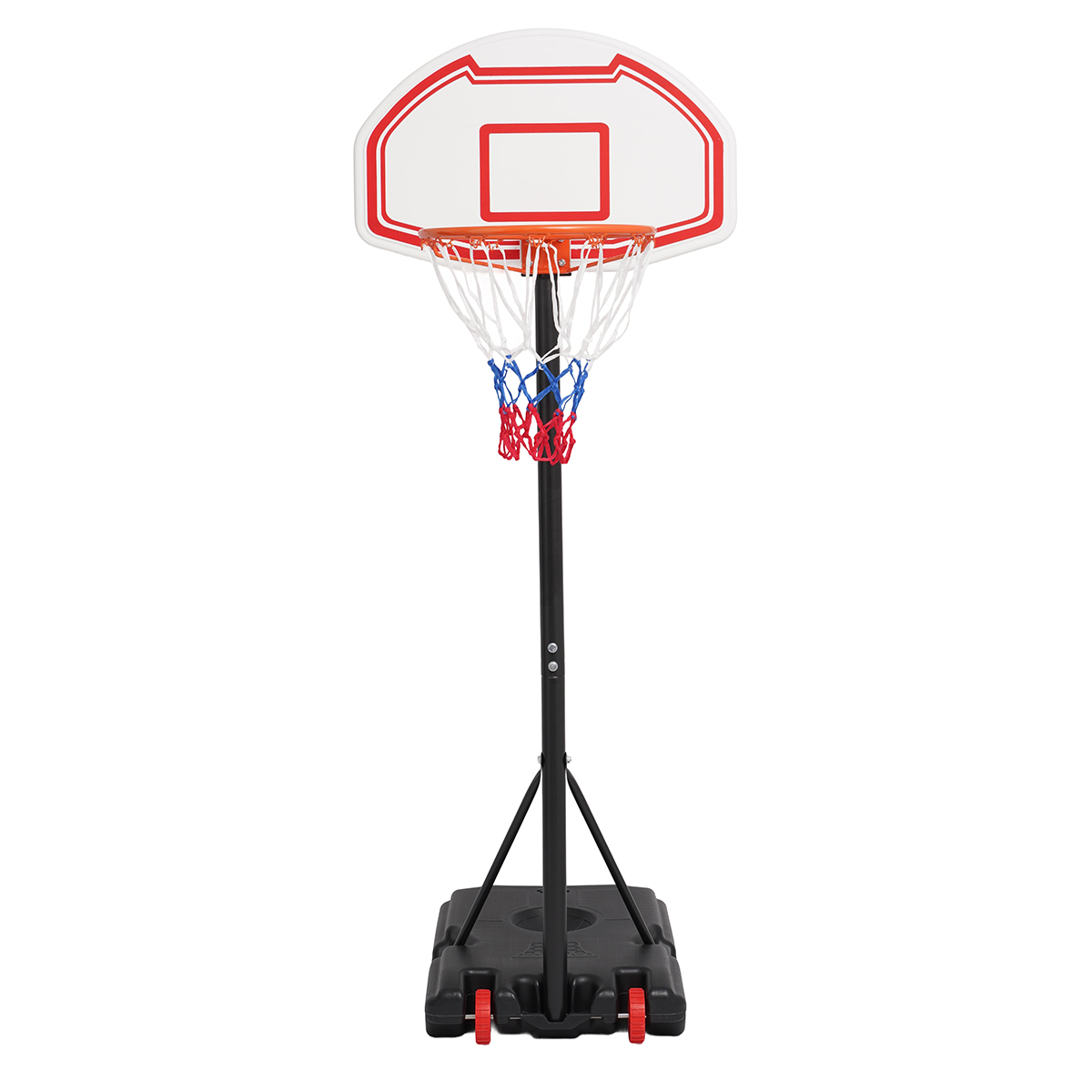 The basketball set includes a height-adjustable backboard with a hoop, a pole and a mobile base.