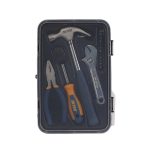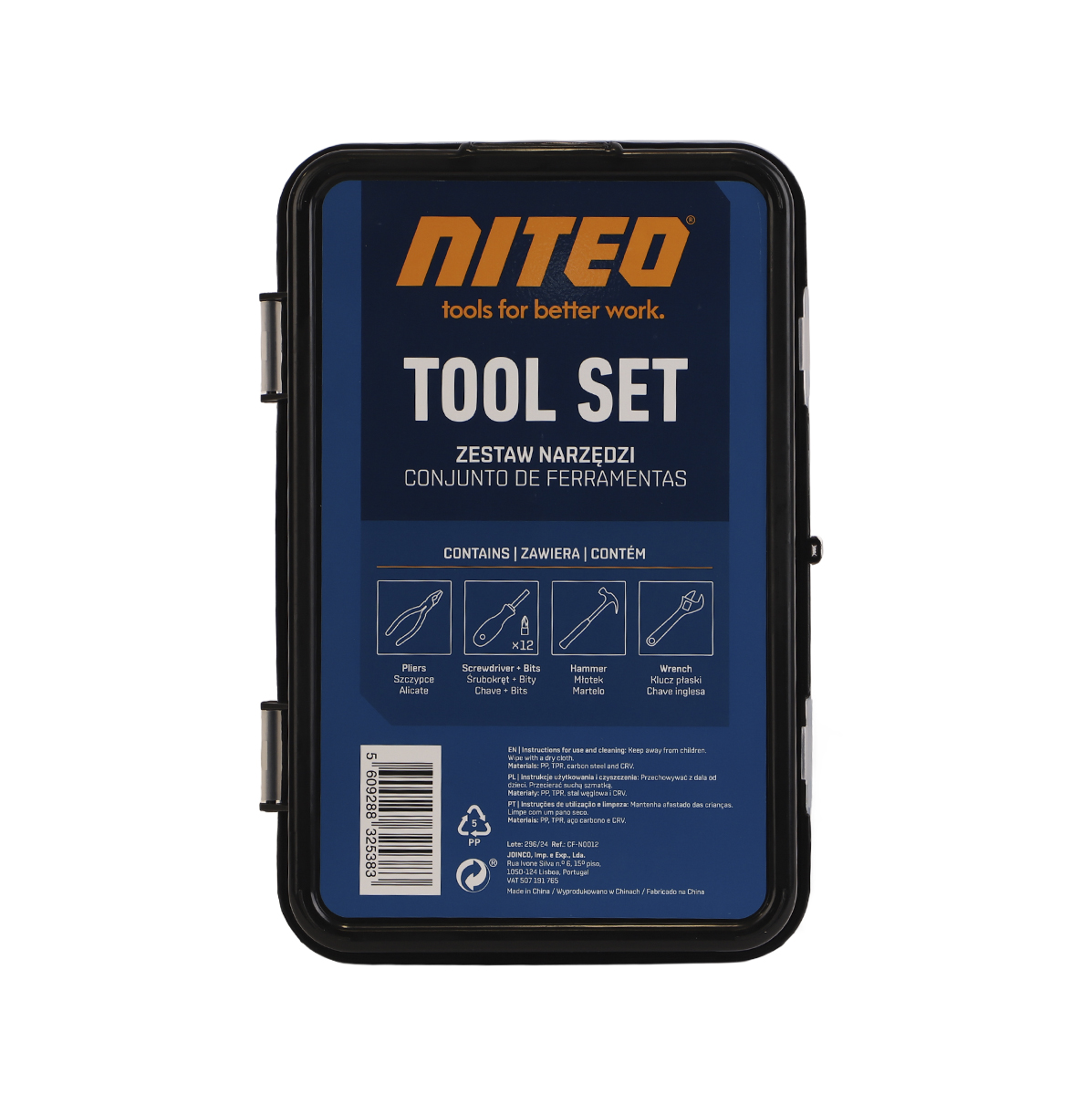 Tool set includes: 1 pliers, 1 wrench with 12 bits, 1 hammer, and 1 adjustable spanner.